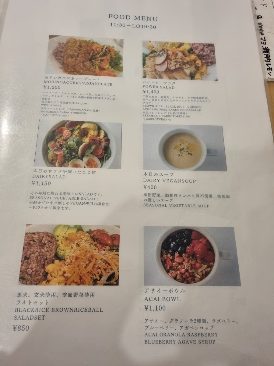 Don’t miss the Daily Salad, a colorful array of seasonal vegetables accompanied by free-range boiled eggs and avocado, perfectly paired with an assortment of organic bread. Priced at ¥1,150, this dish not only pleases the palate but also nourishes the body. If you’re in the mood for something lighter, try the Daily Vegan Soup, a rich blend featuring kombu and almond milk that is always changing to offer something new for your tastebuds, available for ¥400.